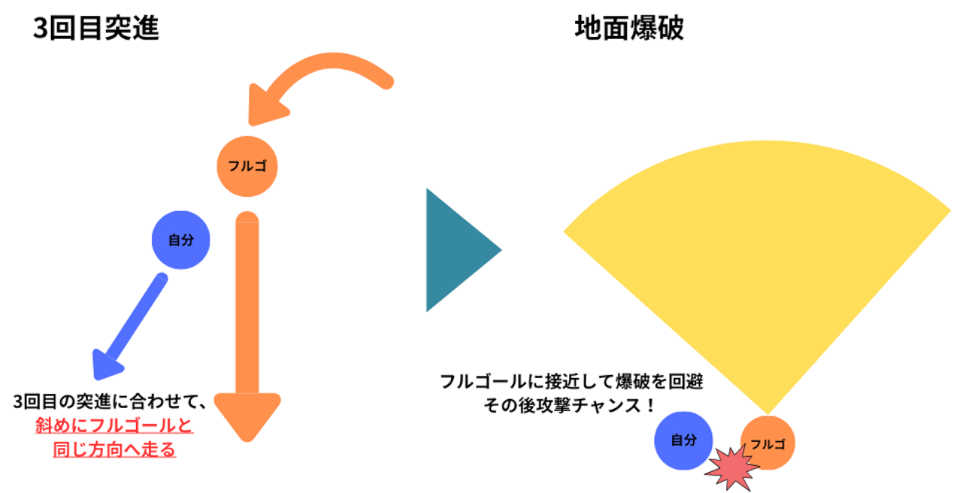 距離を離すにしても接近するにしても、タイミングが遅いと爆破に巻き込まれてしまう。ポイントとしては上図のように3回目の突進でフルゴールと反対方向にいくか、同じ方向に疾走することで安全に退避できる。