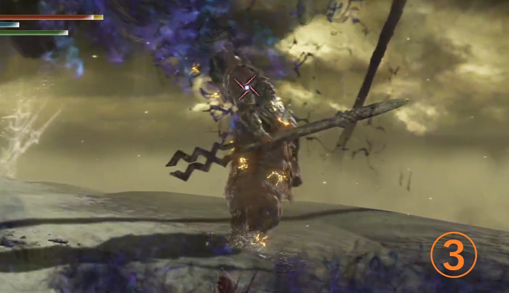 耐電状態が間に合わなかったり、そもそも雷属性持っていない場合はギミックのキャンセルは難しい。地面の突き刺しと合わせて巨剣の噴出をローリングで回避しよう。タイミングは武器が突き刺さったのと同時で回避すればOK