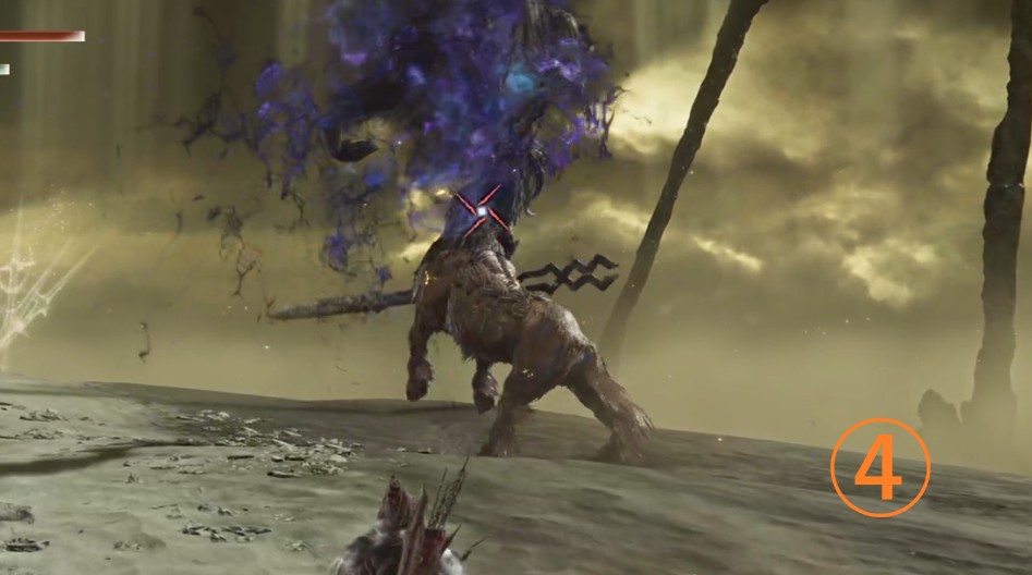 攻撃の予備動作から一気に距離をつめてくる突き攻撃。予想以上に推進力がありリーチがあるので、届かないと思って被弾してしまうことがあるので注意。予備モーションを見たら前ローリングで回避しよう
