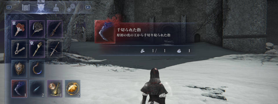 ナメレスを倒した後、最後のエリアで所持品の「千切られた指」を捨てて、遺体に触れる。