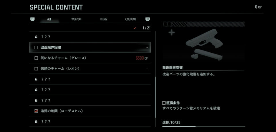 全部で25個あるラクーン君メモリアムをすべて破壊すると、特典としてSPECIAL CONTENTの「改造限界突破」が解放します。