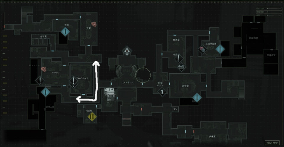 療養所の攻略が中盤になると料理長ゾンビがプレイルームの周りを徘徊するようになる(上図参照)。